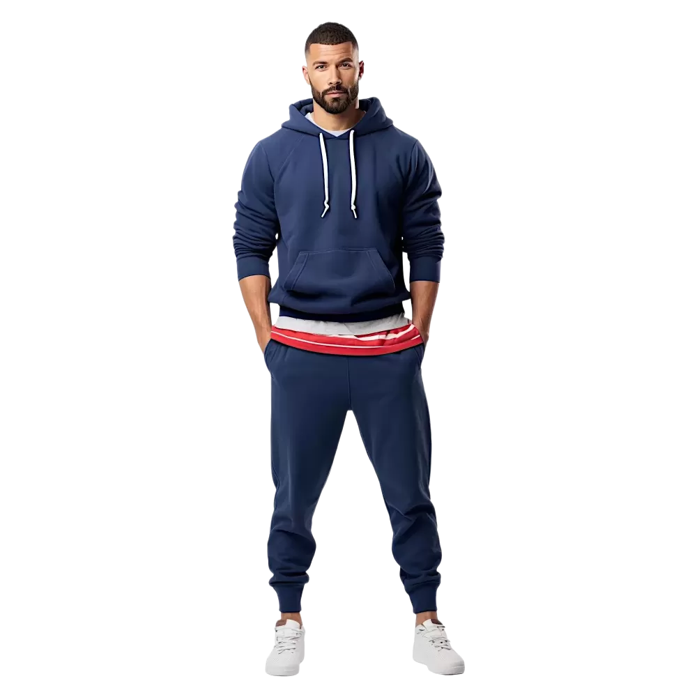 The tracksuit features a cozy hoodie with adjustable drawstrings and elastic jogger pants with a stretch waistband for a perfect fit. Side pockets provide space for small essentials. Casual Navy is a must-have for men looking for effortless comfort and style.