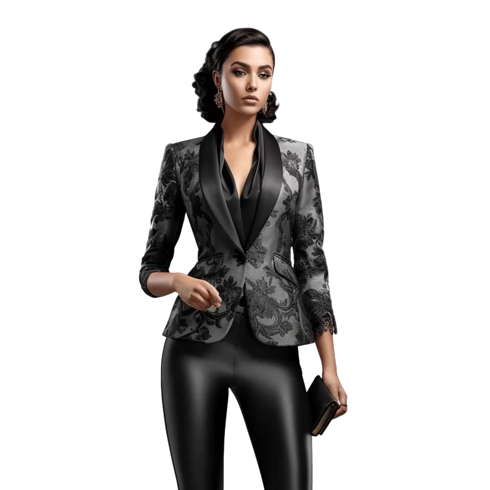 Ta wyjątkowa marynarka damska to uosobienie klasy i stylu. Elegancki fason, wykonany z wysokogatunkowej satyny, nadaje całości luksusowego charakteru. Wzór w delikatne motywy florystyczne sprawia, że model ten przyciąga uwagę i idealnie nadaje się na wieczorowe wyjścia.